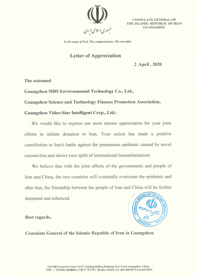 常言道:錦上添花易,雪中送炭難。對于GVS視聲、廣州市科技金融促進(jìn)會和廣州石頭造環(huán)??萍脊煞萦邢薰驹晾实臏嘏袆?,伊朗駐華使館和伊朗駐廣州總領(lǐng)事館分別發(fā)來感謝信。